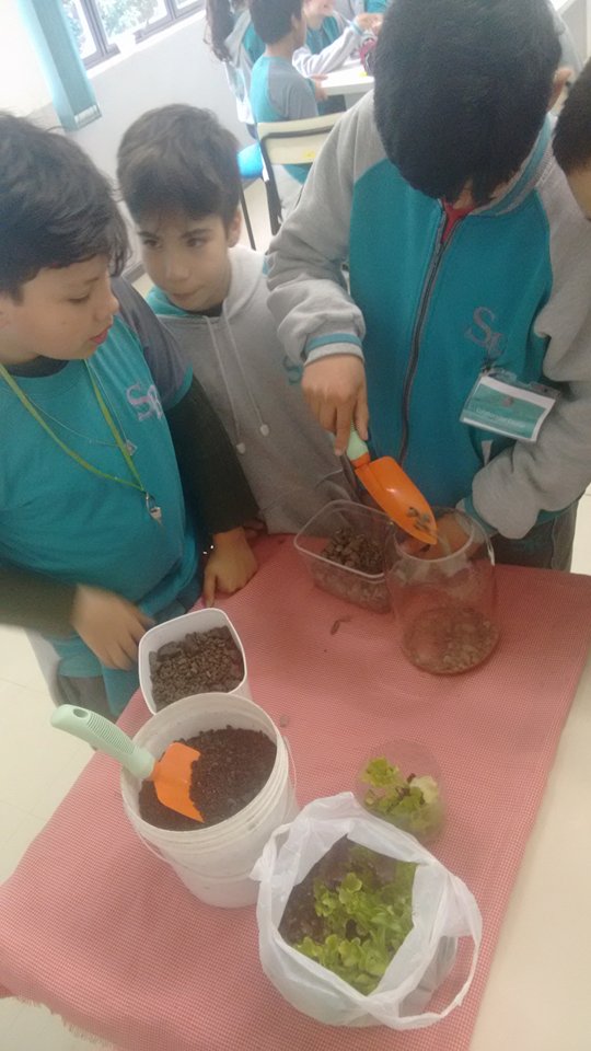Com o terceiro ano foi a vez de realimentar as composteiras que foram montadas a mais de um mês e já haviam diminuído muito o volume de retos de vegetais. Aproveitou-se que o cardápio do almoço foi sopa de legumes para ocupar as sobras do preparo da refeição. A metodologia foi simplesmente, abrir as composteiras e após ter diminuído os pedaços com uma faca, adicioná-los nos respectivos compartimentos.